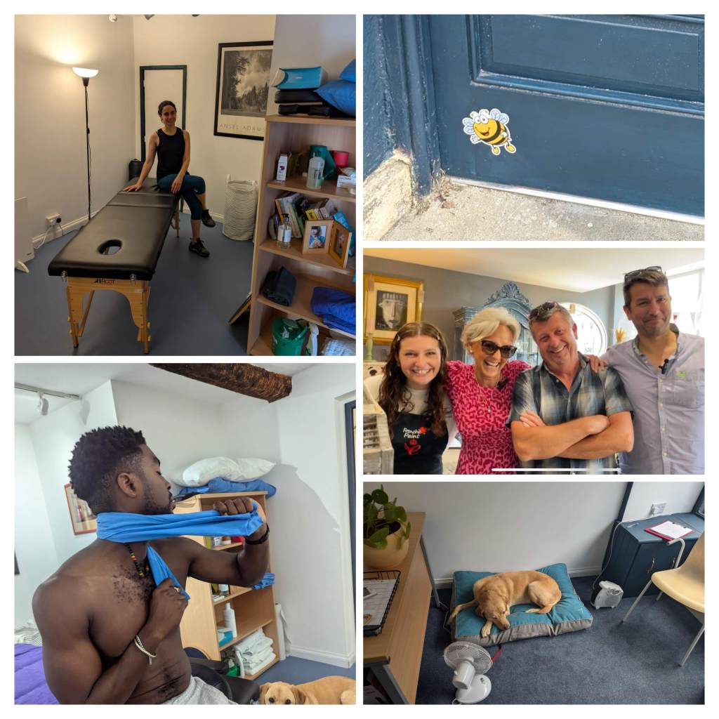 So here is Lau (top left) my wonderful pain therapist. The busy bee is due to being visited everyday by a lovely little boy who loves bees so I thought I would give him and little sticker. The gang are all from Fifi’s wonderful shop who furnish me with regular cups of tea and the occasional glass of bubbly. My dog, Ben is enjoying being part of the clinic although it can get a bit hot in reception and of course, my favourite model, Romaine.